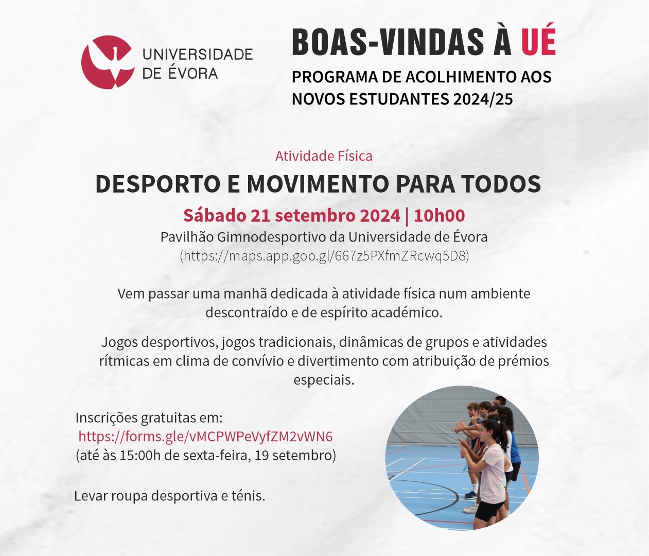 No âmbito do Programa de Aconlhimento aos Novos Estudante 2024/2025, organiza-se a atividade física "Desporto e Movimento para Todos".