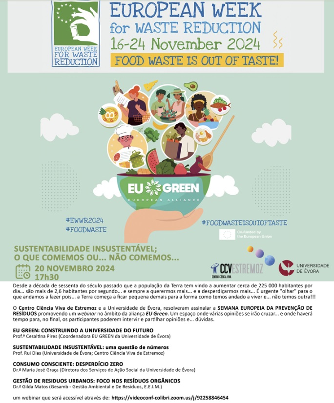 Na Semana Europeia da Prevenção de Resíduos (EWWR), o Centro de Ciência Viva de Estremoz (CCVEstremoz), em articulação com a Universidade de Évora, tem o prazer de anunciar um evento especial integrado na aliança Europeia EU GREEN que abordará um dos temas mais urgentes da atualidade: o desperdício alimentar.
