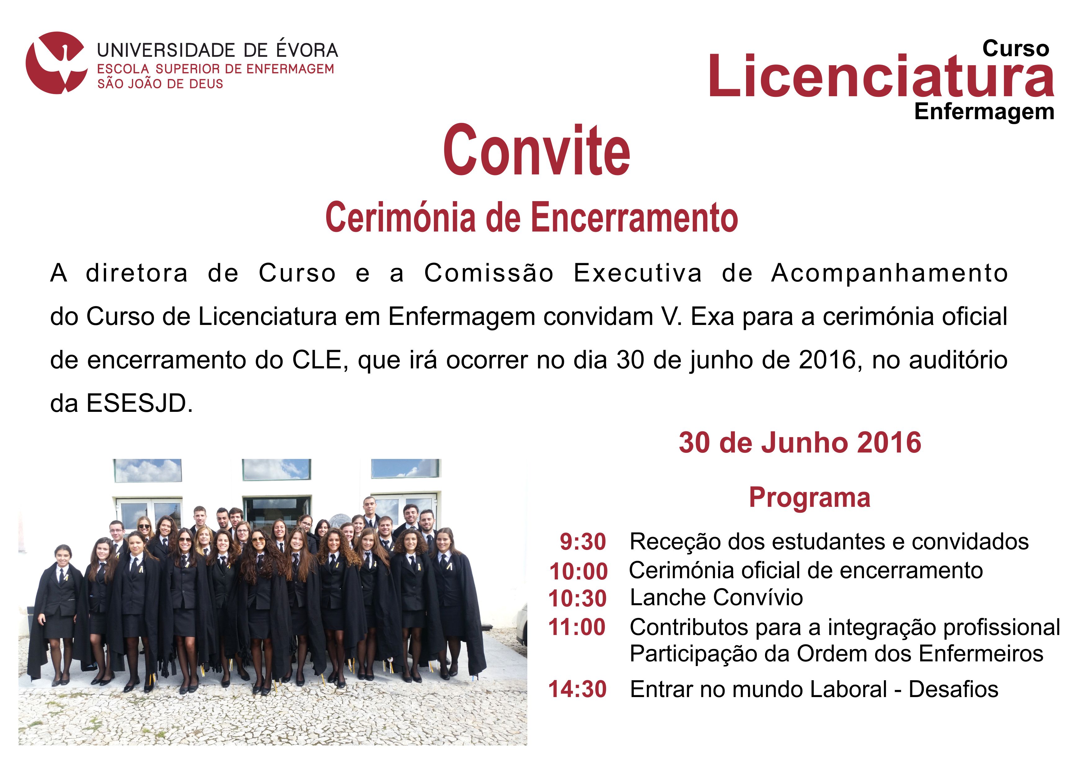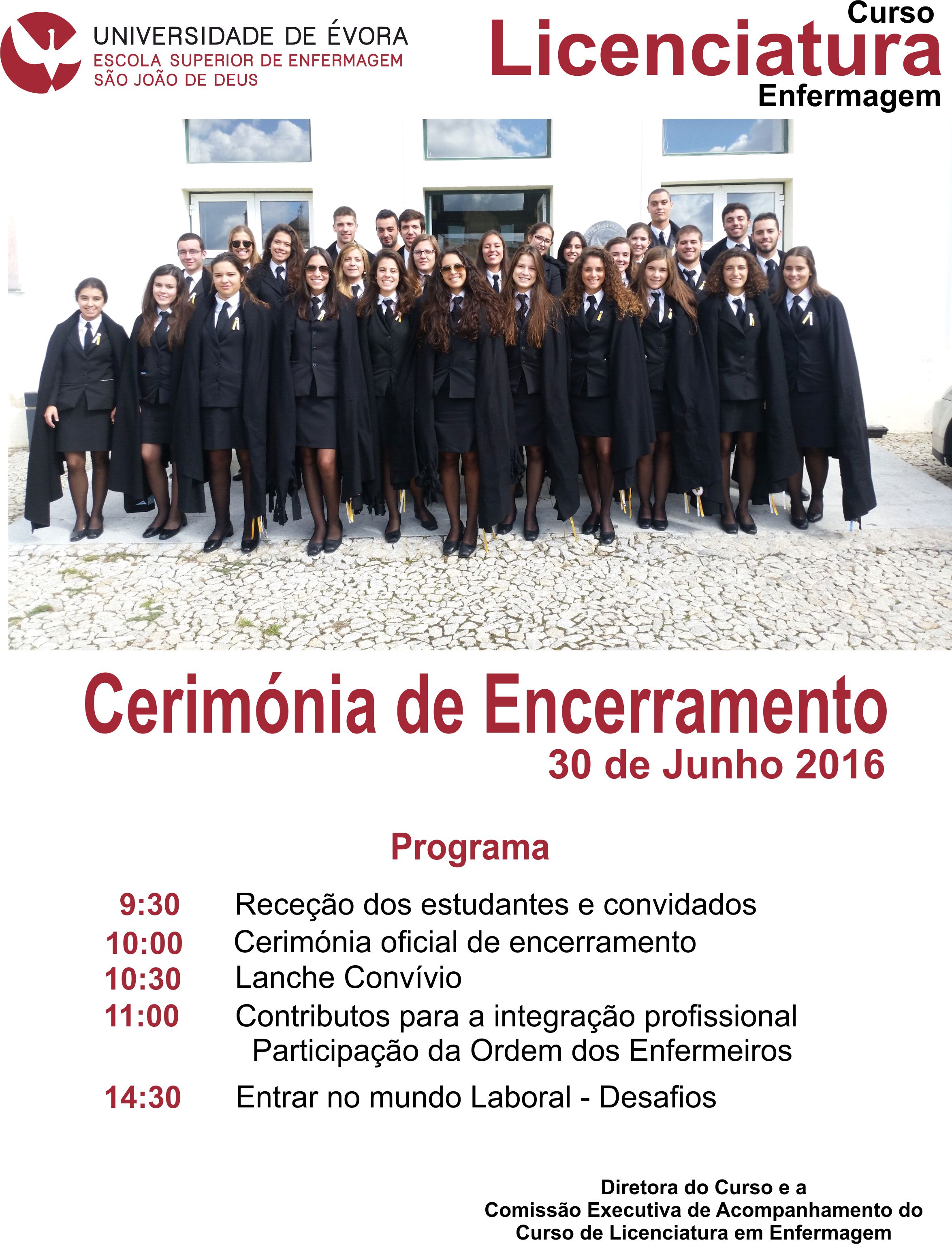 A cerimónia oficial de Encerramento do 25º CLE terá lugar no dia 30 de junho de 2016 na Escola Superior de Enfermagem S. João de Deus de acordo com o seguinte programa: