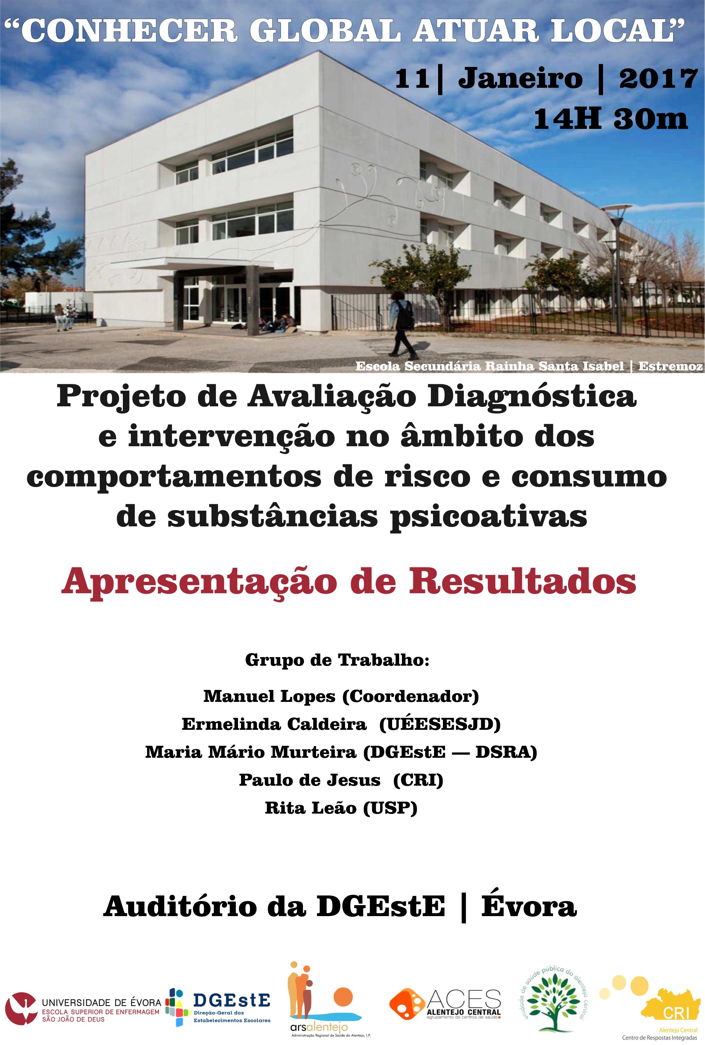 A apresentação de resultados obtidos no âmbito do Projecto de avaliação diagnóstica e intervenção no âmbito dos comportamentos de risco e consumo de substâncias psicóticas terá lugar no próximo dia 11 de janeiro de 2017, no auditóro da DGEstE, às 14h:30 min.