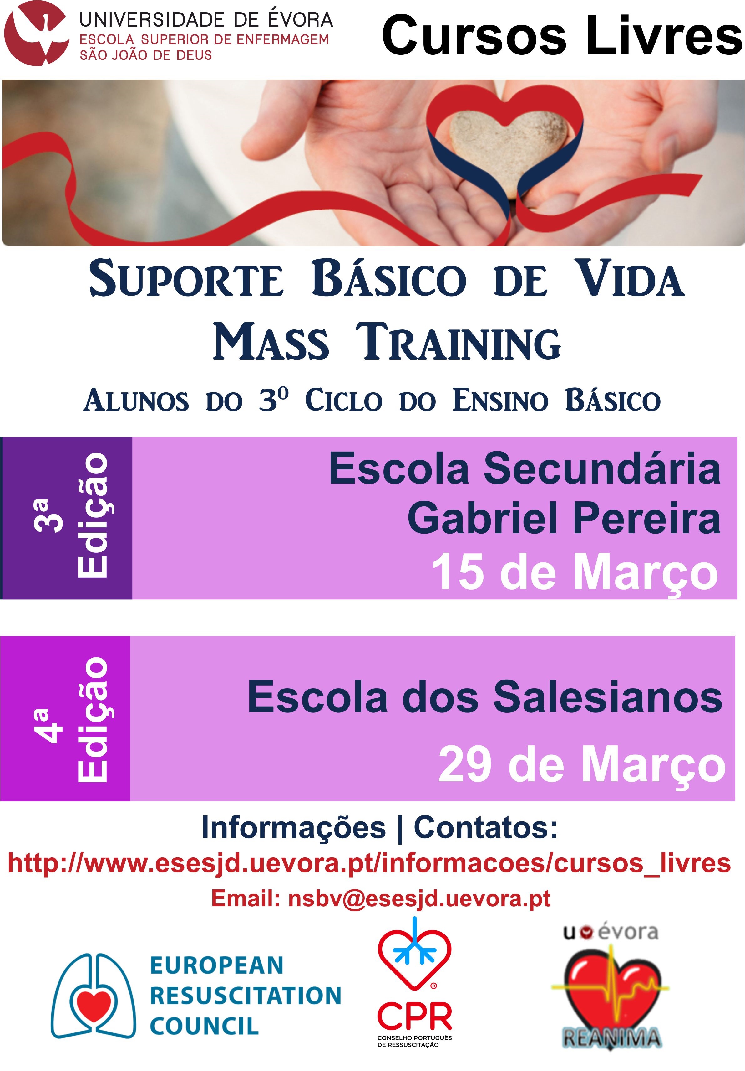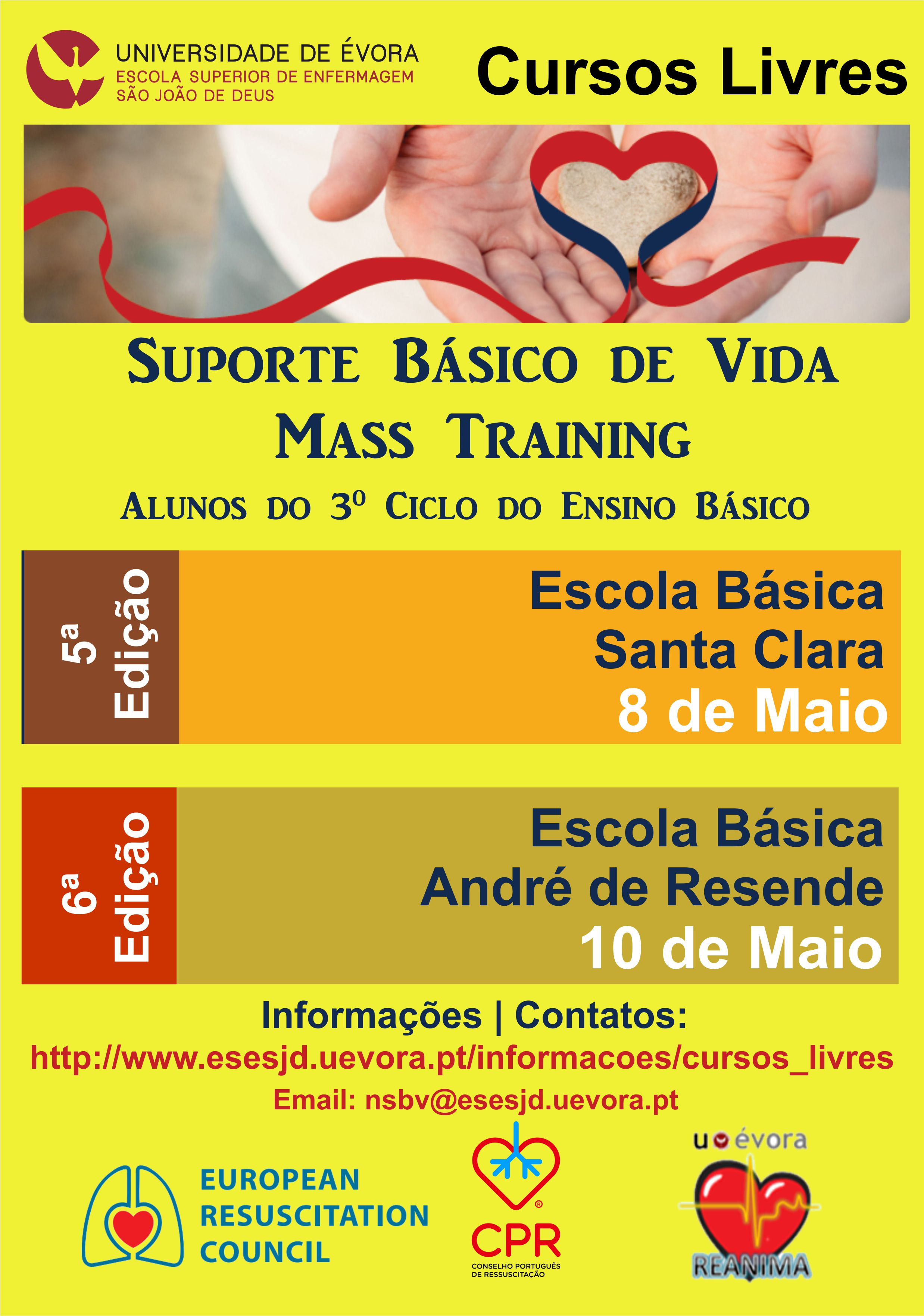 As ações de sensibilização em Mass Training de Suporte Básico de Vida decorrerão nas Escolas Secundárias de Évora e pretende-se abranger cerca de 250 formandos, de modo a adquirirem competências em Suporte Básico de Vida e colocar em prática gestos simples que podem salvar vidas.