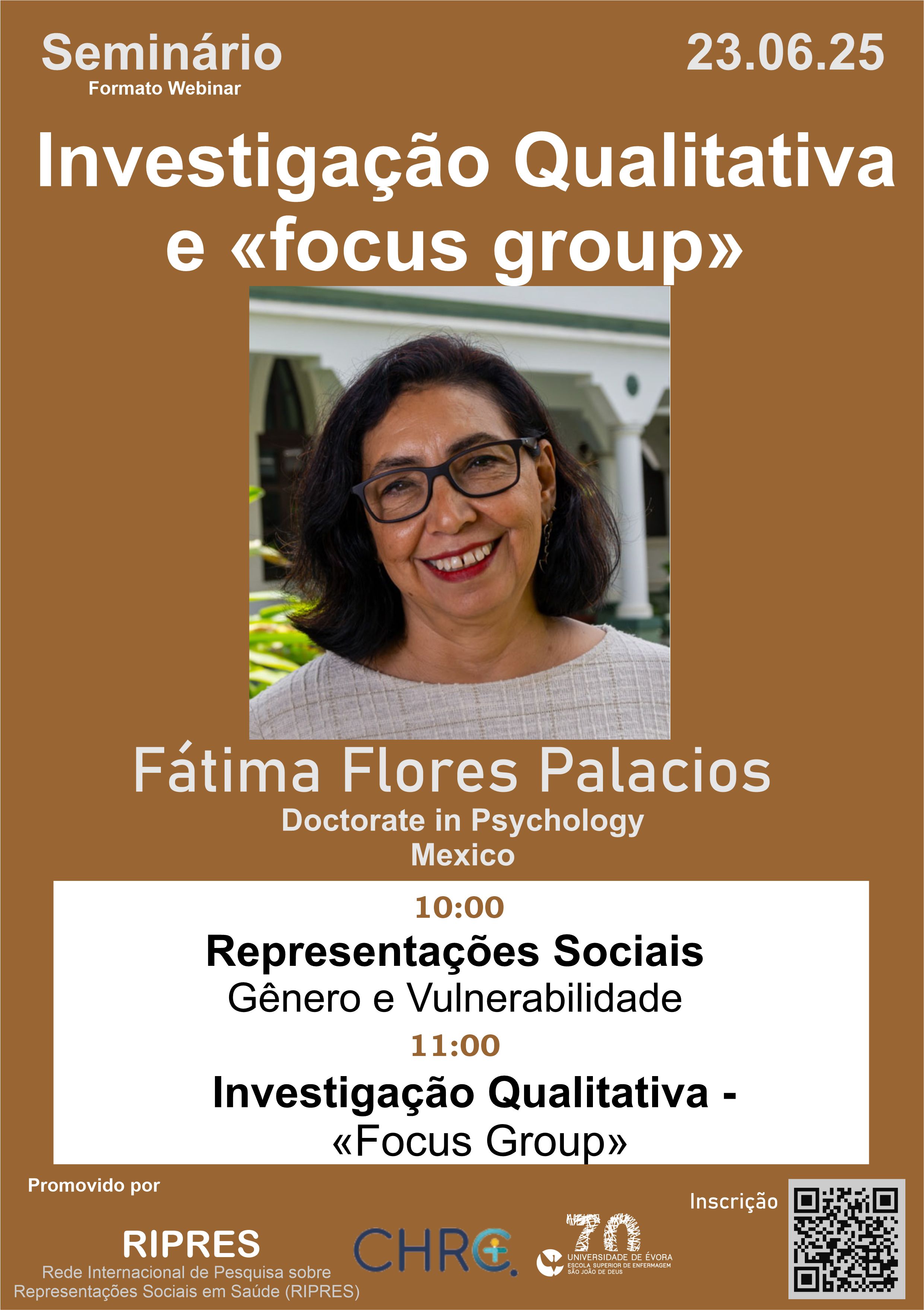No âmbito desses objetivos Irá realizar-se dia 23 de junho de 2025, um seminário com o tema Investigação Qualitativa e «Focus Group» que conta com a participação da Professora Doutora Fátima Flores Palacios (Mexico), doutorada em Psicologia. Este seminario irá realizar-se no formato Webinar em que será obrigatório efetuar a sua inscrição.